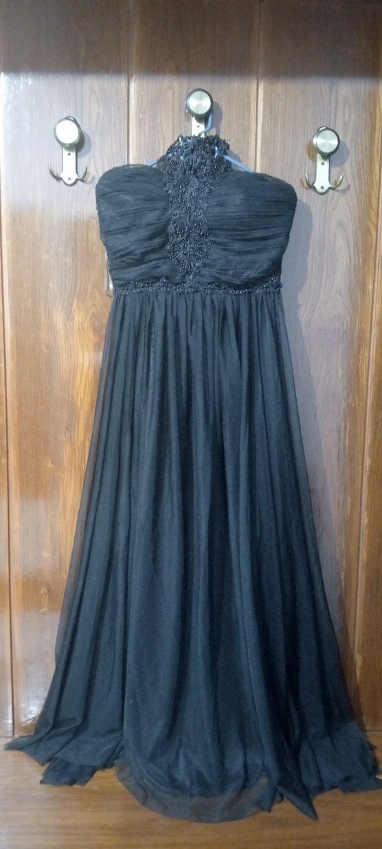 Siyah straplez bu abiye elbise, drapeli ve nakışlı detaylara sahip dar kesim üst kısmıyla dikkat çekiyor. Uzun ve kolsuz tasarımı, gotik ve klasik zarafeti yansıtıyor.