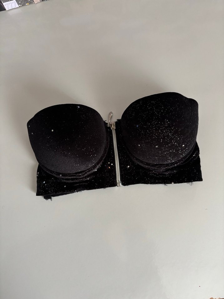 Siyah straplez, kısa ve dar kesimli bustiyer. Ön fermuarlı, parlak detaylı yumuşak sentetik kumaştan yapılmıştır. Cesur ve göz alıcı bir tasarım. ✨
