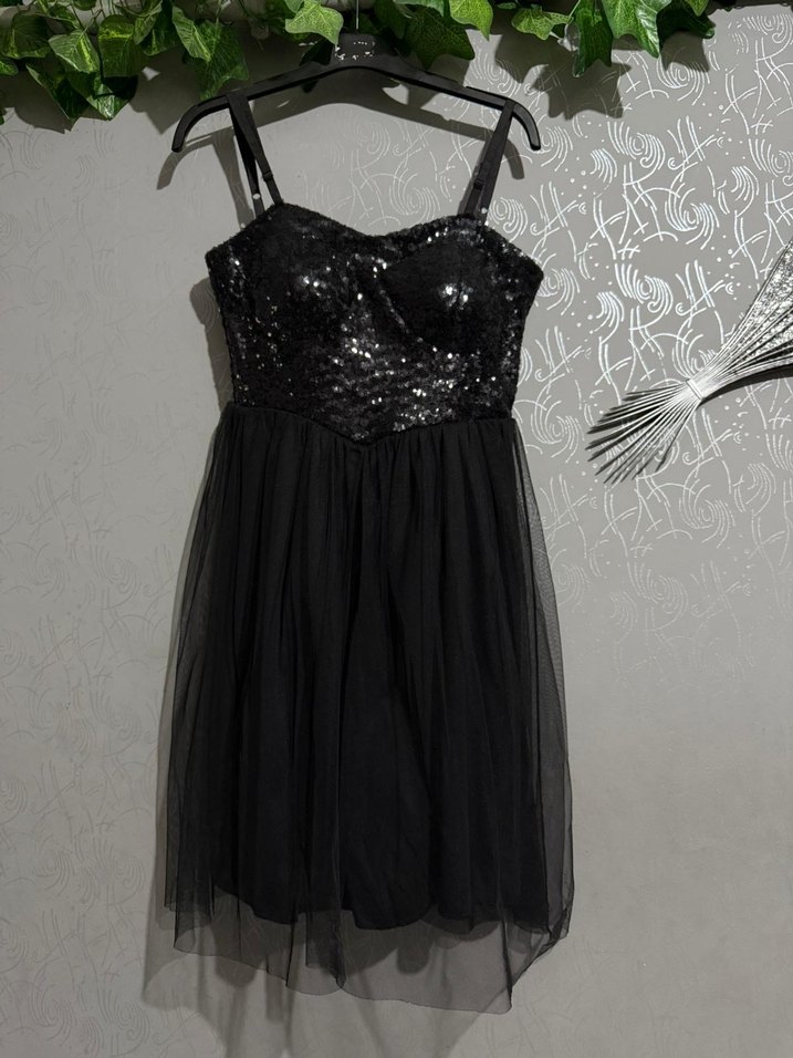 Siyah straplez, askılı, payetli ve işlemeli gotik elbise, dikkat çekici parti kıyafeti olarak öne çıkar. ✨ İçi astarlı. Sorunsuz Göğüs 38cm Koltuk Altından itibaren boyu 70 cm Askıları ayarlanabilir