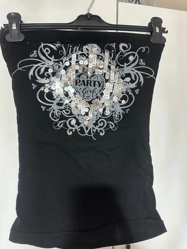 Siyah straplez, vücuda oturan, payetli baskılı, kolsuz gotik tarzda kadın bluz.