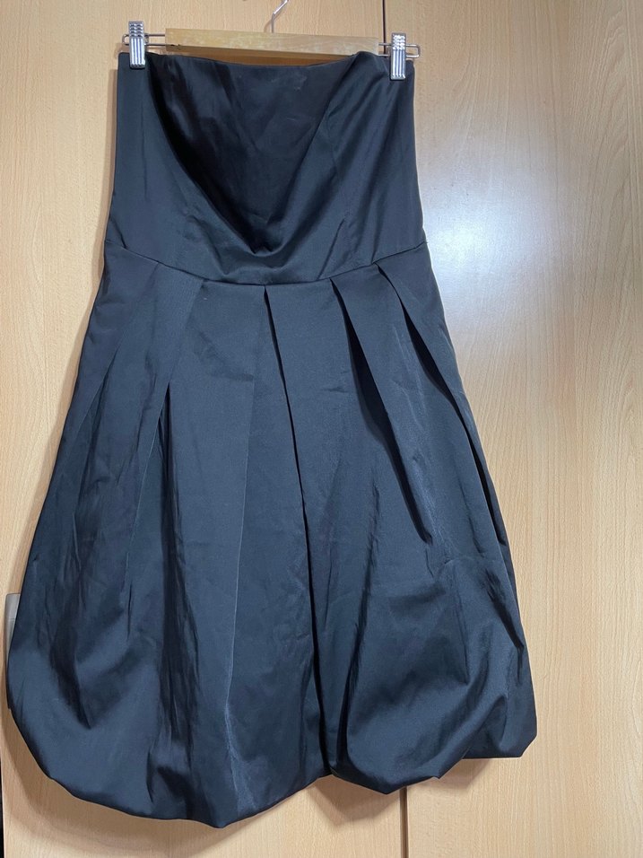 Siyah renkli, straplez ve pilili tasarıma sahip midi boy abiye elbise, bol kesim ile şık bir parti görünümü sunar. Balon eteklidir