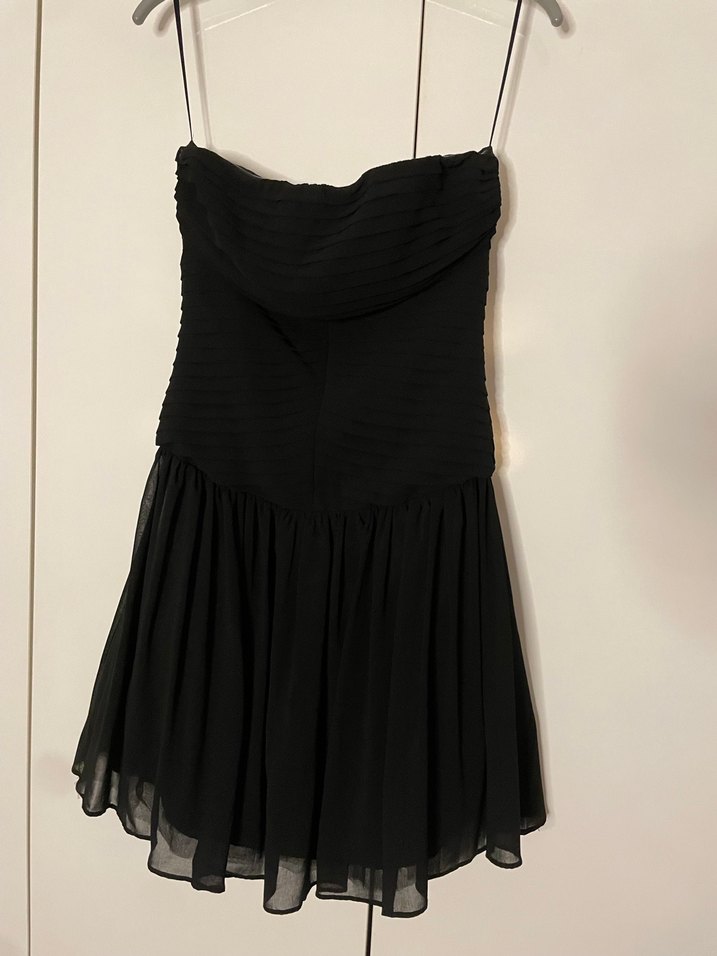 Siyah straplez elbise, pilili ve vücuda oturan üst kısmı ile mini etekten oluşur. Gotik tarzda parti için uygundur.