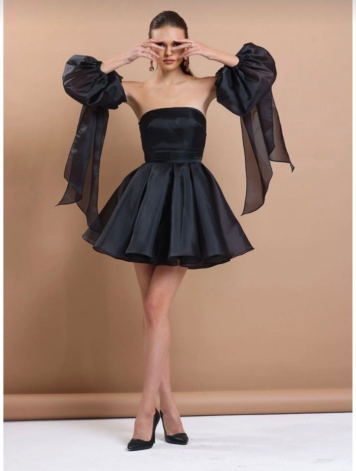 Siyah, straplez, sıkı kesim mini elbise, drapeli ve dikkat çekici strappy kollarla avant-garde parti tarzı için uygundur. Bir defa kullanıldı kuru temizlemeye verildi temizdir.