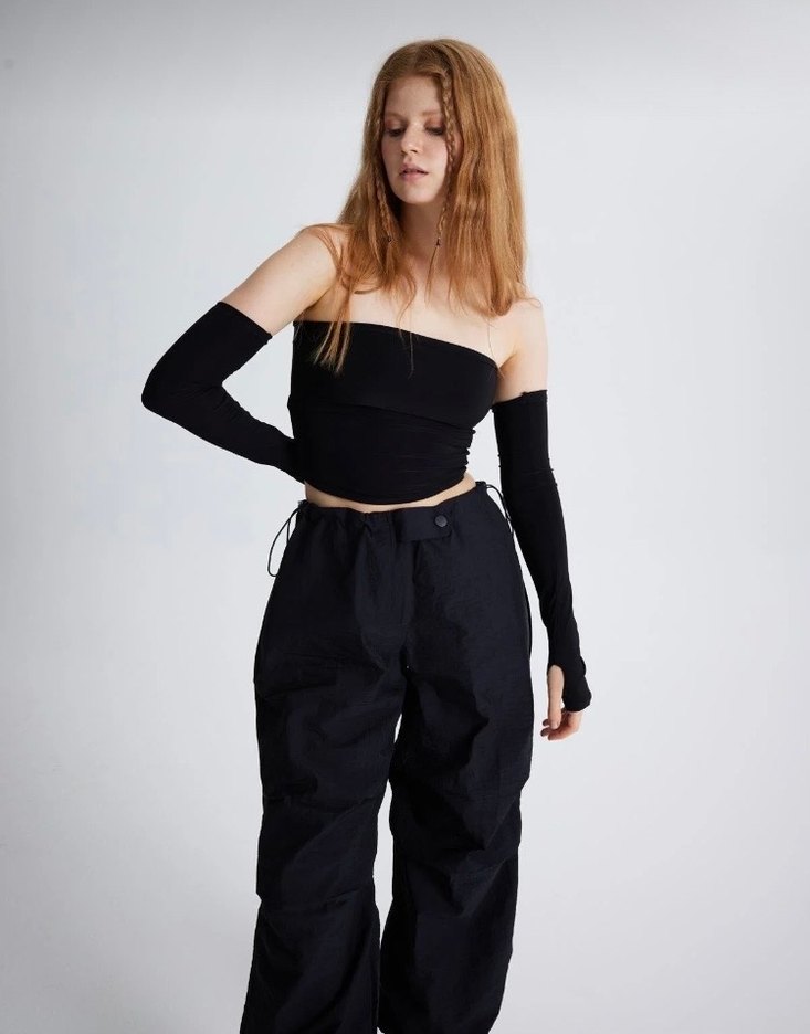 Siyah straplez crop top ve ek kollarla. Desensiz tasarımı, dış mekan sokak modasına uyum sağlar. Kollukları kullandım o yüzden yıprandı ama straplez cropu sadece bir kez giydim. Marka Holly Lolly.