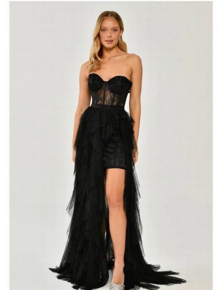 Straplez yaka ve fırfırlı detaylara sahip, sıkı kesim siyah uzun elbise, cesur gotik tarz için ideal. Düğünde bir kere giyildi.