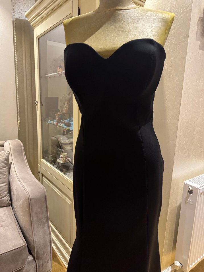 Siyah, straplez, uzun ve drapeli detaylı bu abiye elbise, cesur ve göz alıcı bir görünüm sunar. Kolsuz ve vücuda oturan kesimiyle romantik akşamlar için uygundur. Balık model