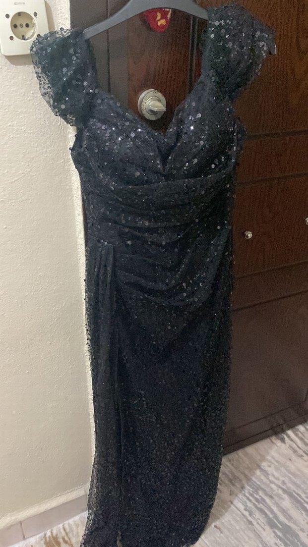 Siyah straplez, drapeli ve desenli uzun abiye klasik ve pullu . son fiyattir