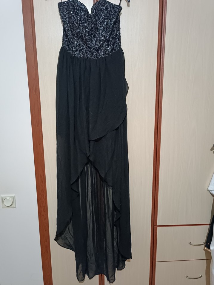 Siyah straplez uzun abiye elbise, loose fit ve draped detaylarıyla gotik stil için uygun. Kolsuz ve uzun boyda, şıklığı avant-garde dokunuşla buluşturur. Etek uçlarında minimal düzeyde yıpranma var.