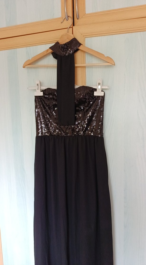 Siyah abiye elbise, straplez yakalı ,Avrupa tasarım Üst kısmı parlak payetlerle süslenmiş, rahat kesim ve uzun boydadır.