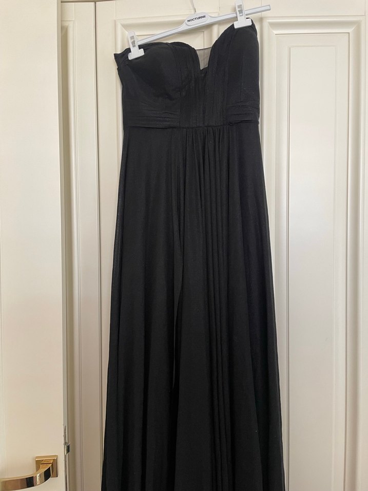Siyah straplez uzun abiye elbise, drapeli detaylarla ve ince askılarla tasarlanmıştır. Fitted kesimiyle gotik tarzda şık bir seçenek sunar.
