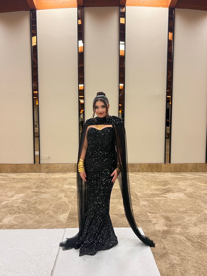 Elbise 40-42 beden aralığında kiralıktır. Siyah straplez, uzun ve drapeli bu dar kesim abiye, desenli ve gotik tarzıyla dikkat çeker. Düğünler için şık ve iddialı bir tercih. ✨