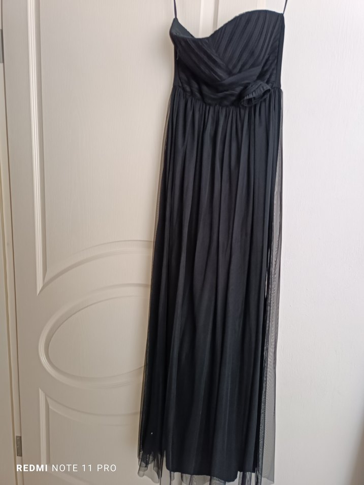 Bu siyah abiye, straplez yaka ve drapeli detaylarıyla gotik stil ve klasik zarafeti birleştirir. Düğünler için uygun.