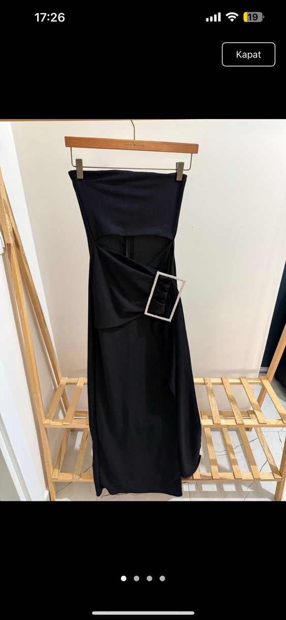 Düz siyah, straplez yakalı, kemerli detaylı ve vücuda oturan uzun elbisedir. Kaygan sentetik kumaştan üretilmiştir.
