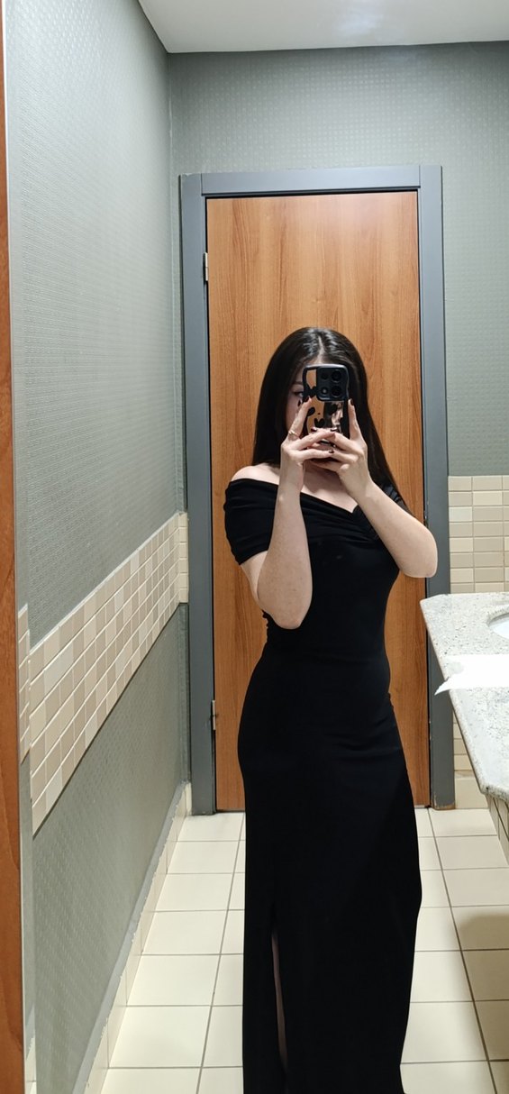 Siyah straplez, kısa kollu, vücuda oturan midi elbise. Yanında yırtmaç bulunur ve romantik gece için uygun.