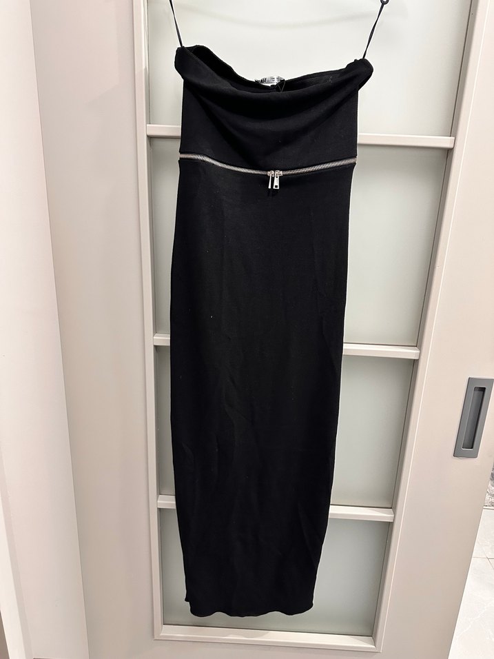 Siyah, straplez ve askılı uzun elbise, sentetik kumaştan yapılmıştır. Orta bölümde fermuar detayı vardır, romantik akşamlar için uygundur.