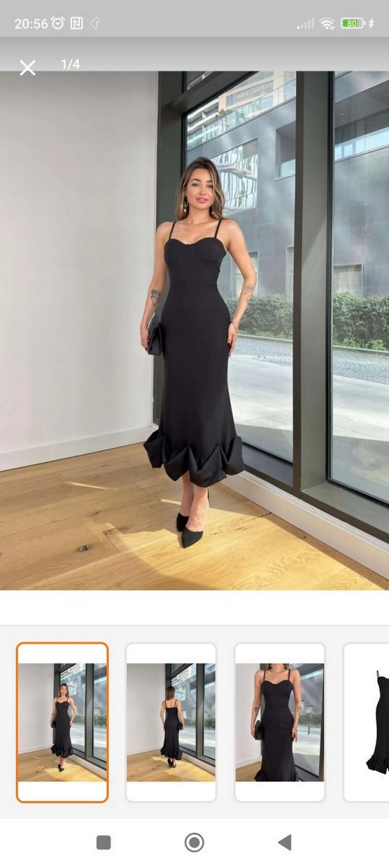 Siyah uzun elbise, ince askılı straplez yakaya ve etek ucunda fırfır detayına sahip. Düz kesim ve sentetik kumaştan, romantik buluşmalar için ideal. ✨