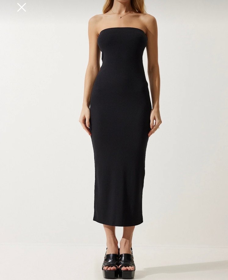 Siyah, straplez ve kolsuz uzun elbise, düz ve şık tasarıma sahip. Sentetik kumaştan üretilmiş, minimal ve zarif bir görünüm sunar.