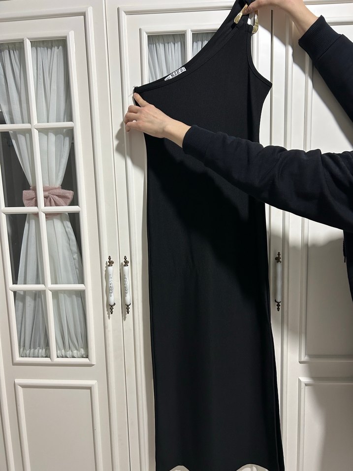 Siyah straplez uzun elbise, yırtmaçlı ve vücuda oturan kesime sahip, düz ve sentetik kumaştan üretilmiştir.