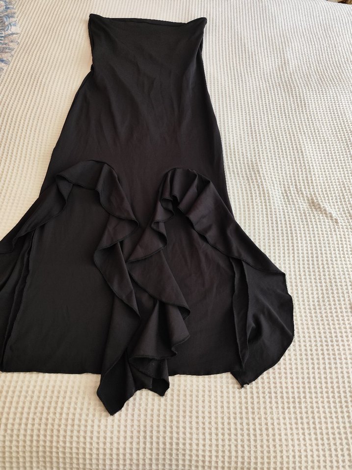 Siyah, straplez, uzun ve vücuda oturan elbise, fırfır detaylı ve kolsuz tasarıma sahip. Gotik tarzda romantik akşamlar için uygun.