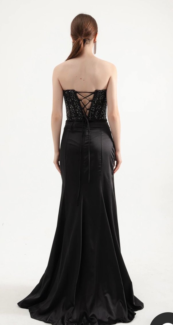 Siyah straplez, drapeli ve askılı uzun elbise, gotik tarzıyla romantik akşamlar için uygundur. Sırt kısmında bağcıklı detay bulunur. Bir kere 3 saat giyildi