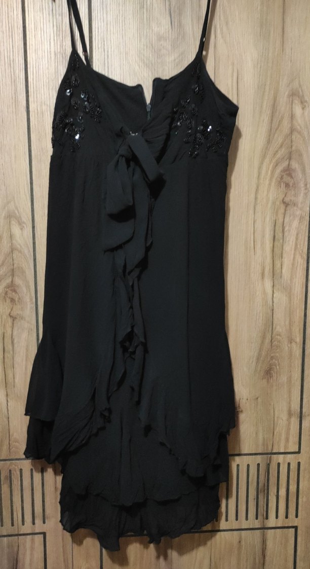 Siyah straplez abiye elbise, işlemeli detaylar ve fırfırlarla gotik tarzda, bol kesim, parti için uygun.ic göstermez göğüs kısmı açılıp kapanabilir iki kez giyildi sadece