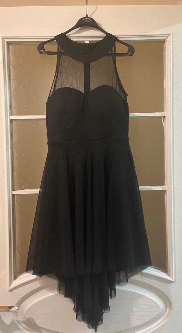 Siyah straplez yaka, drapeli ve kolsuz uzun abiye elbise. Üst kısmında şeffaf tül detay bulunur, gotik parti tarzı için uygundur. Xs s bedene de uygundur likralı esniyor