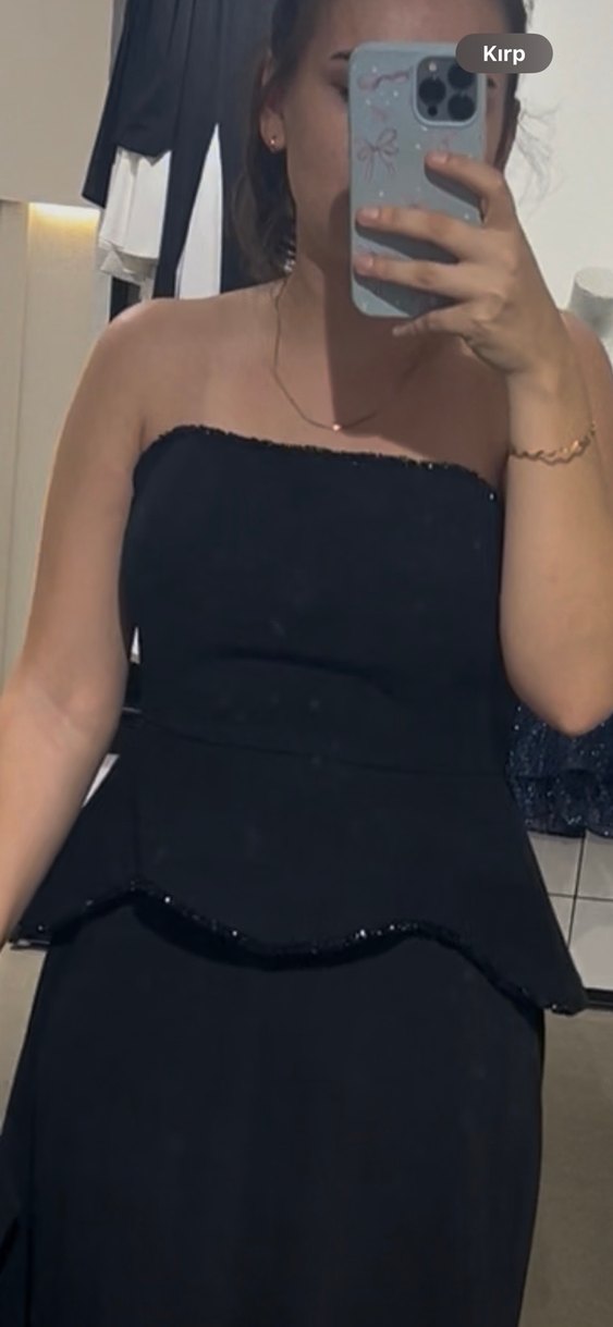 Siyah straplez uzun elbise, drapeli tasarımı ve regular fit kesimiyle klasik gotik stile uygun. Kolsuz ve desensizdir. 40 beden fakat 38 e uyumlu