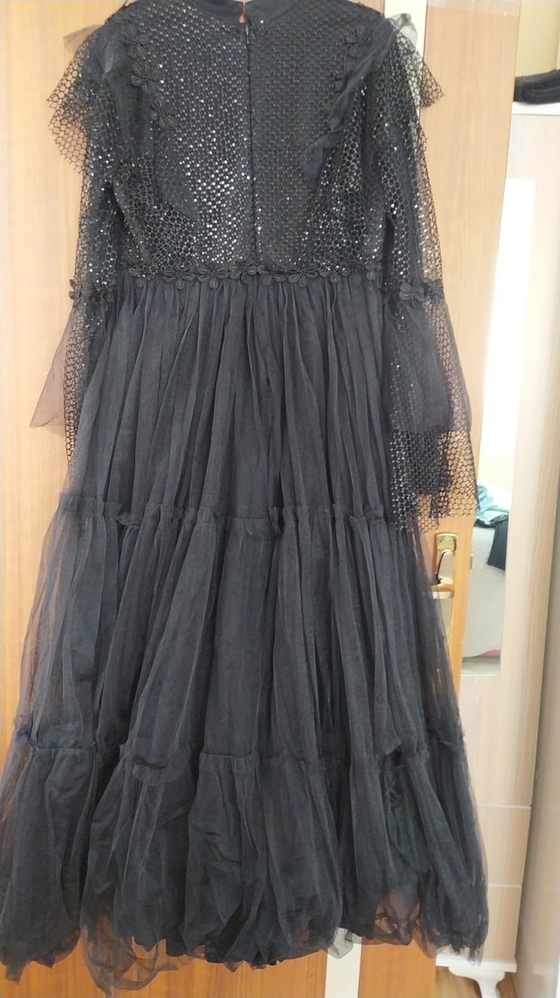 Siyah straplez uzun elbise, fırfırlı ve bol kesimdir. Yumuşak dokulu kumaştan yapılmıştır. Gotik stil ve askılı kollara sahiptir, parti için uygundur.