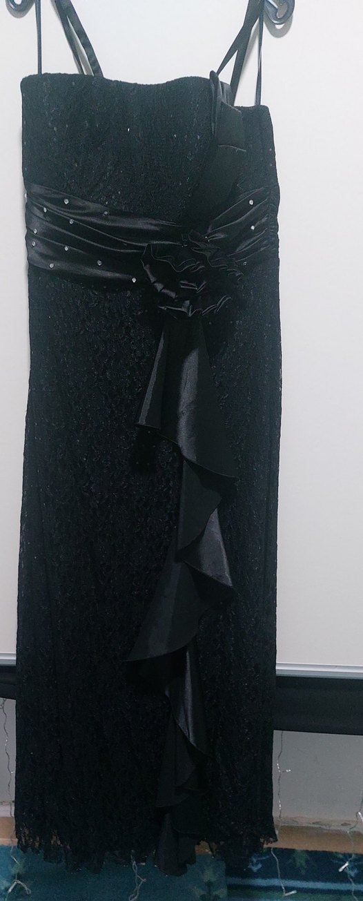 Siyah straplez ve askılı detaylı, desenli kumaştan yapılmış, vücuda oturan uzun gotik elbise, fırfır süslemeleriyle klasik şıklık sunar.