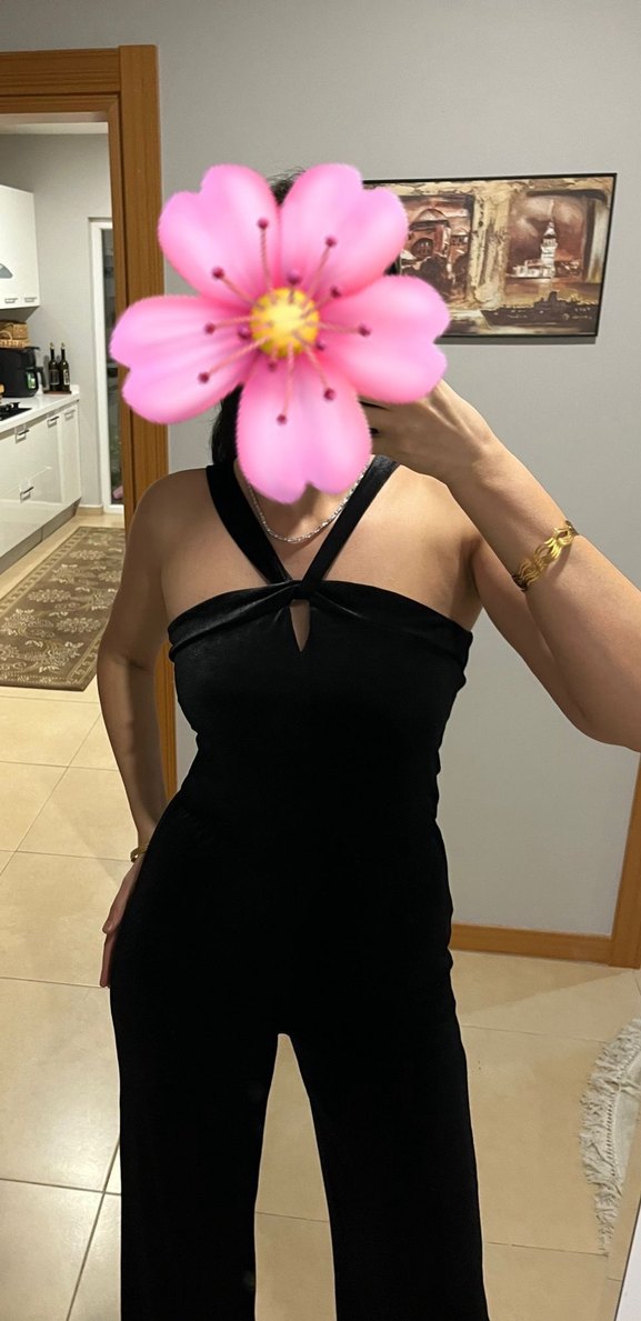 Siyah straplez, tokalı ince askılı, vücuda oturan kadın tulum. İpeksi kumaştan, gotik Paris tarzı, parti için uygun.