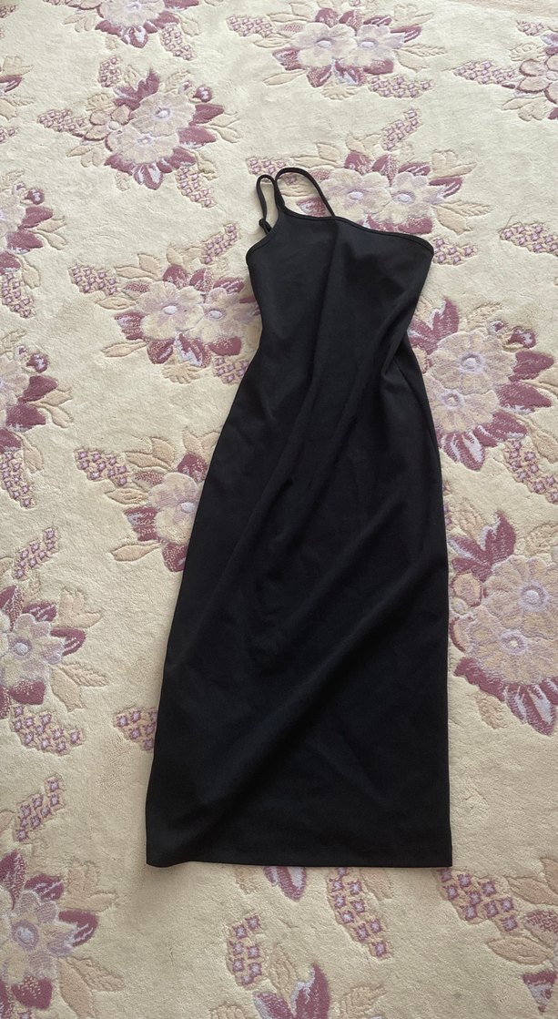 Siyah, straplez yakalı ve drapeli, sentetik kumaştan yapılmış dar kesim uzun elbise. Minimalist gotik tarzıyla klasik bir şıklık sunar.
