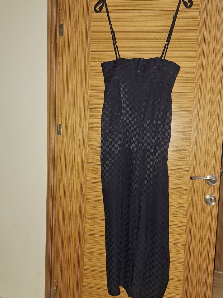 Siyah straplez yaka, pileli sentetik kumaştan yapılmış, vücuda oturan uzun tulum. Gotik tarzda, romantik akşamlar için uygundur.