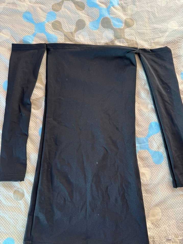 Siyah renkte, straplez yakalı ve uzun kollu, vücuda oturan kadın elbisesi. Drapeli tasarımı ve uzun boyu ile dış mekan etkinliklerine uygundur. Minimalist ve avangart tarz için ideal.