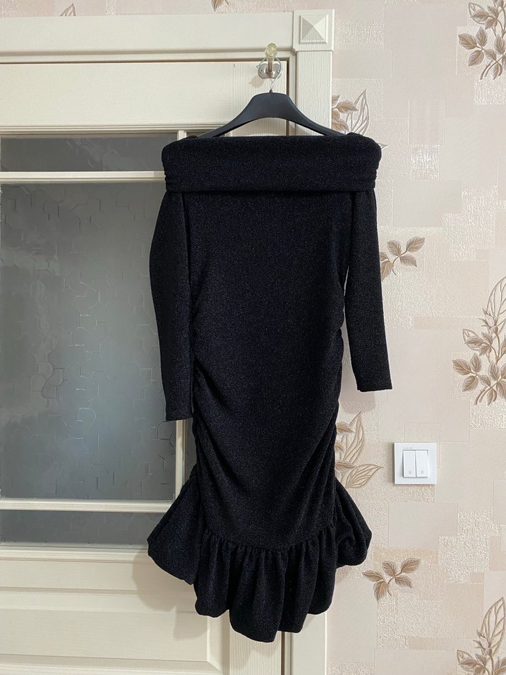 Siyah, straplez yaka ve uzun kollu, vücuda oturan midi boy triko elbise. Cesur, gotik tarzda, rahat ve şık kumaşla günlük kullanıma uygun.