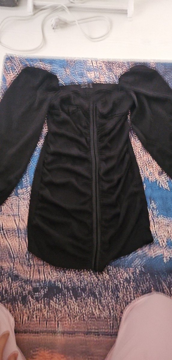 Siyah, önü fermuarlı, straplez ve uzun kollu mini elbise. Hafif batik desenli, gotik tarzda midi boy.