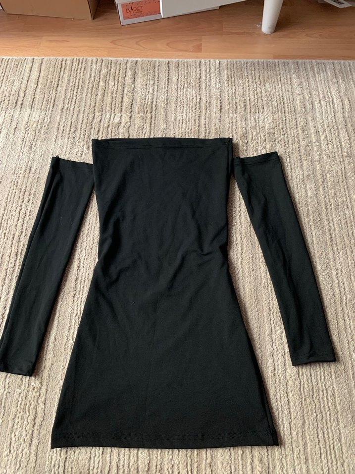 Siyah, straplez yaka ve uzun kollu, vücuda oturan triko elbise. Minimalist ve şık, günlük sokak stili için uygun. Hiç giyilmedi