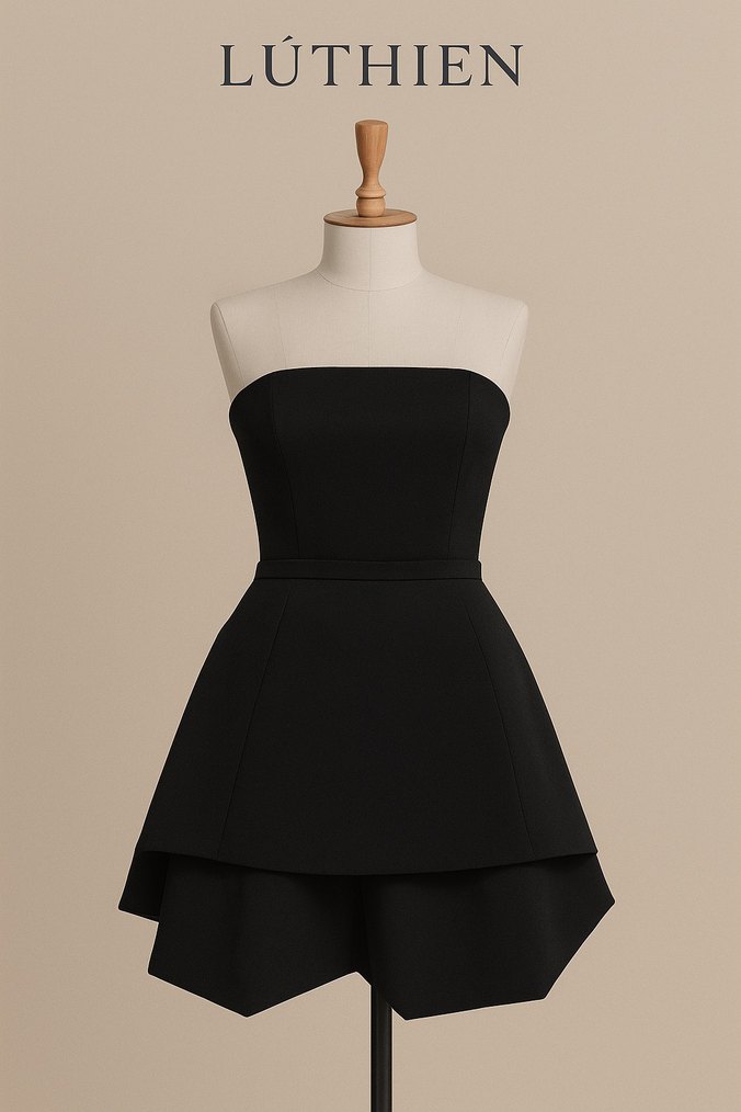 Siyah straplez midi boy abiye elbise, vücuda oturan kesim ve drapeli detaylara sahip, parti için uygun. Minimalist ve gotik tarzda, Luthien imzalı.