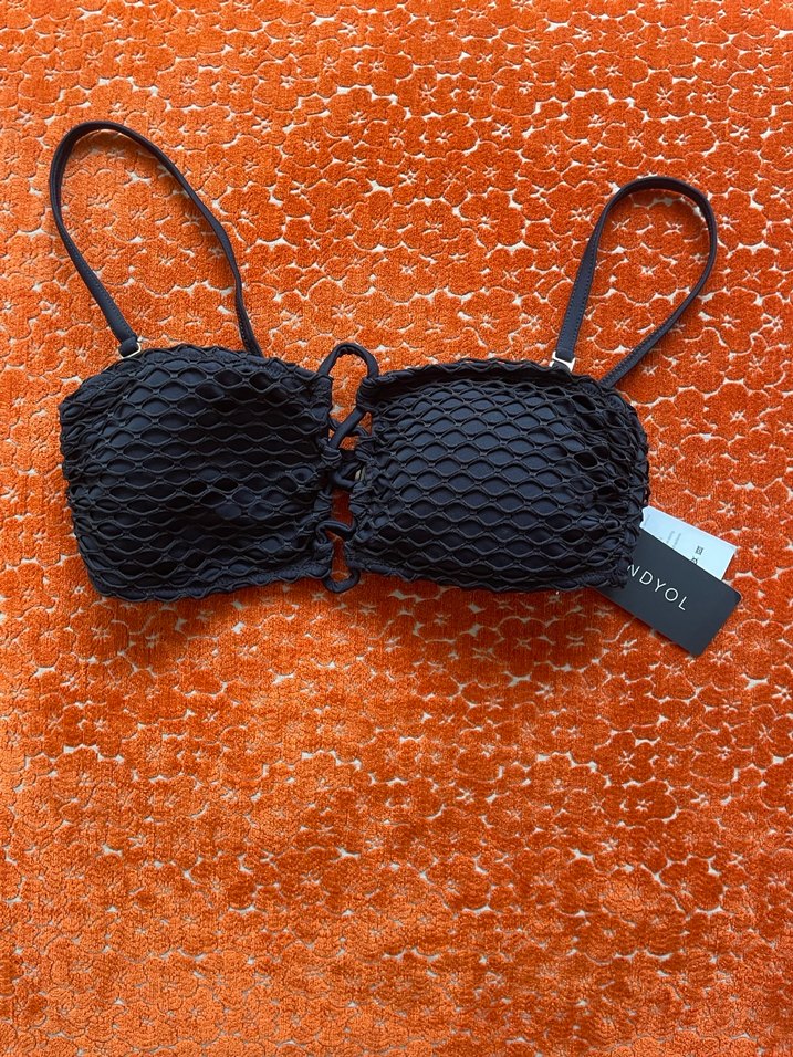 Siyah ve esnek yapılı bu bikini üstü, ince askılı ve vücuda oturan kesimdedir.