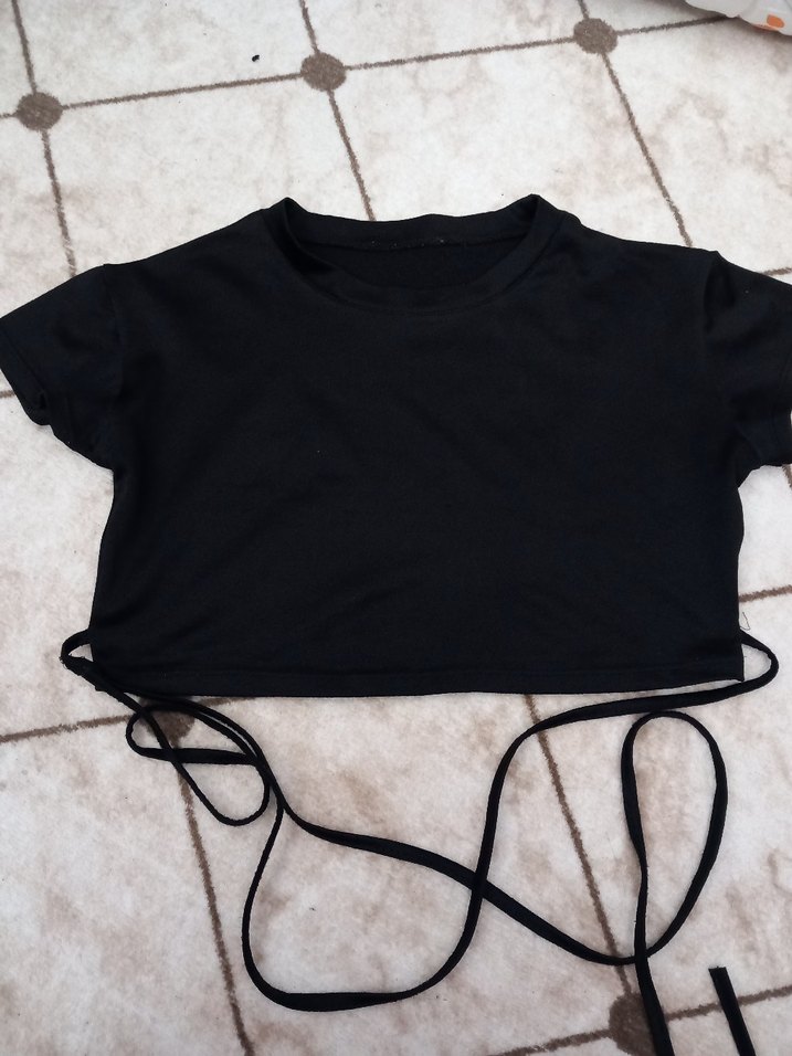 Siyah, vücuda oturan crop top, yuvarlak yaka ve strappy detaylı, yumuşak sentetik kumaştan üretilmiştir. Günlük goth ve athleisure tarzlar için uygun.