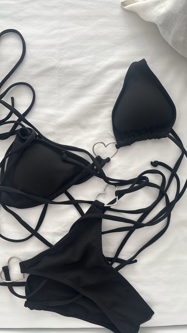 Siyah renkli, elastik bantlı ve kalp şeklinde metal detaylı, strappy askılı, fit kesim bikini. Goth athleisure tarzında, açık hava kullanımı için uygun.