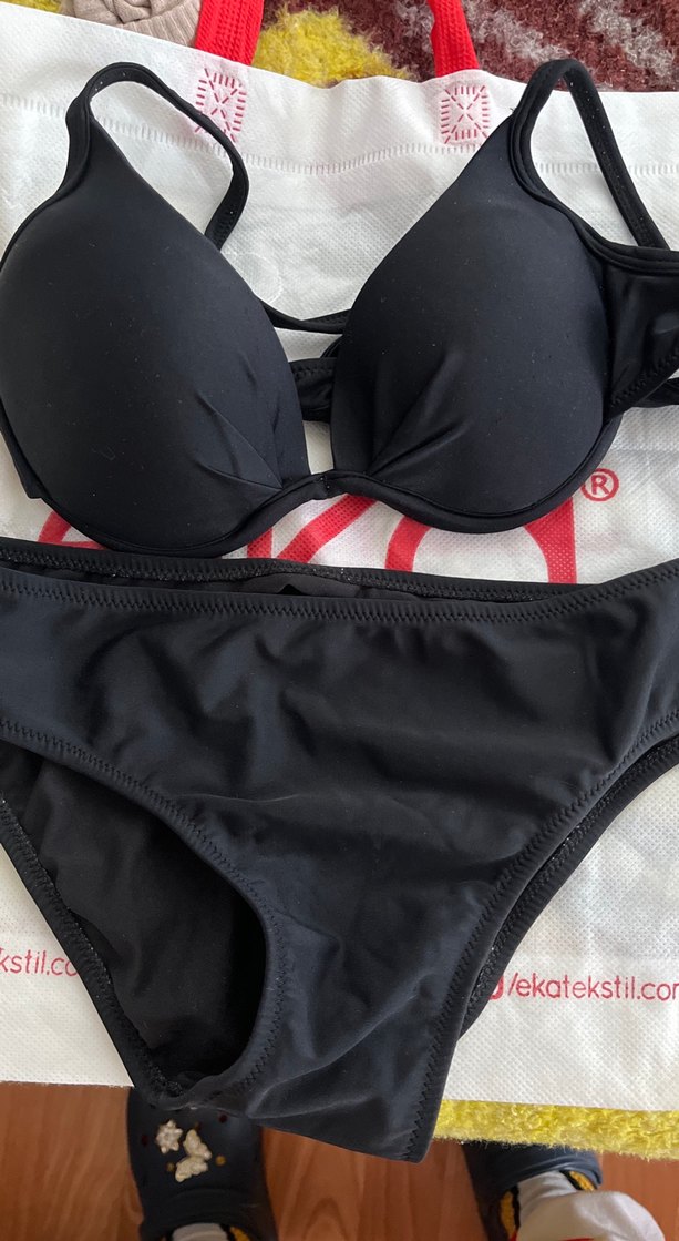 Siyah, strappy detaylı ve elastik kumaştan yapılmış, atletik ve cesur görünüme sahip, normal boy midi bikini takımı. Desensiz ve rahat uyumlu. Hiç kullanmak nasip olmadı …