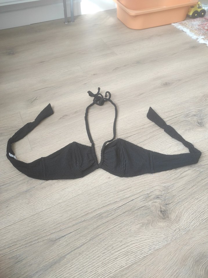 Siyah, strappy askılı, fitted kesim kadın bikini üstü. Minimalist gotik tarzıyla outdoor kullanıma uygun, zahmetsiz şıklık sunar.