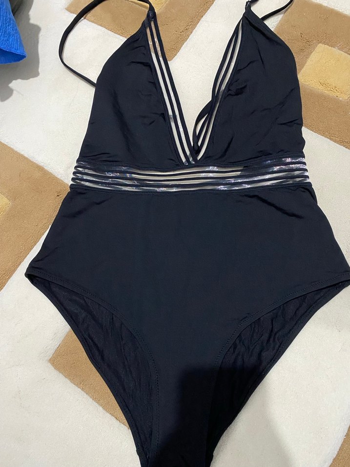 Siyah renkli, strappy askılı ve elastik bel detaylı, derin V yakalı, goth tarzında kadın mayo. Rahat ve şık bir plaj seçeneği. ️