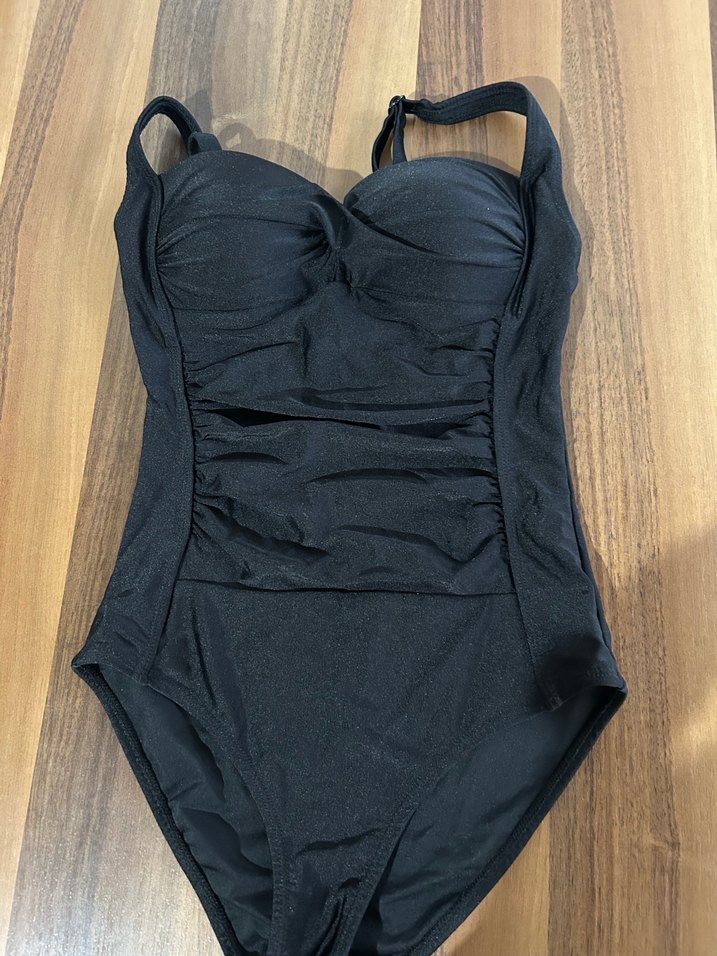 Siyah renkli, askılı ve vücuda oturan kadın mayosu. Minimalist gotik tarzıyla plajda rahat kullanım sağlar.
