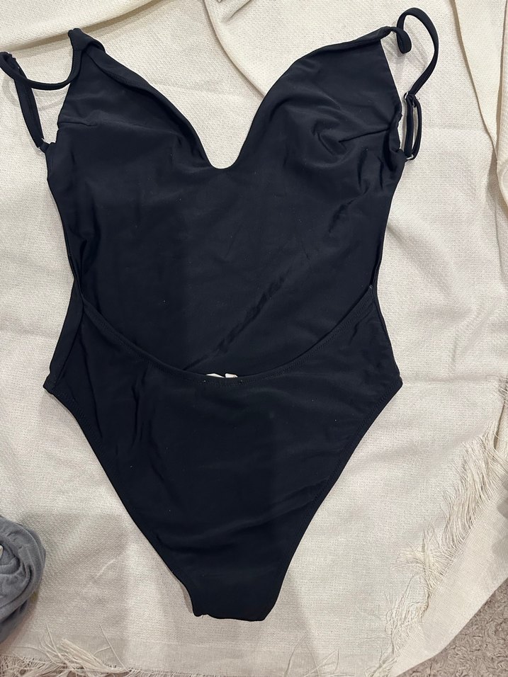 Siyah, strappy askılı, derin yakalı ve vücuda oturan bu mayo, minimal goth tarzıyla şıklığı birleştirir.