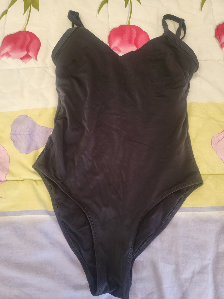 Siyah, dar kesim ve askılı kadın mayo. Desensiz, goth tarzıyla plaj için rahat ve şık bir seçenek sunar.