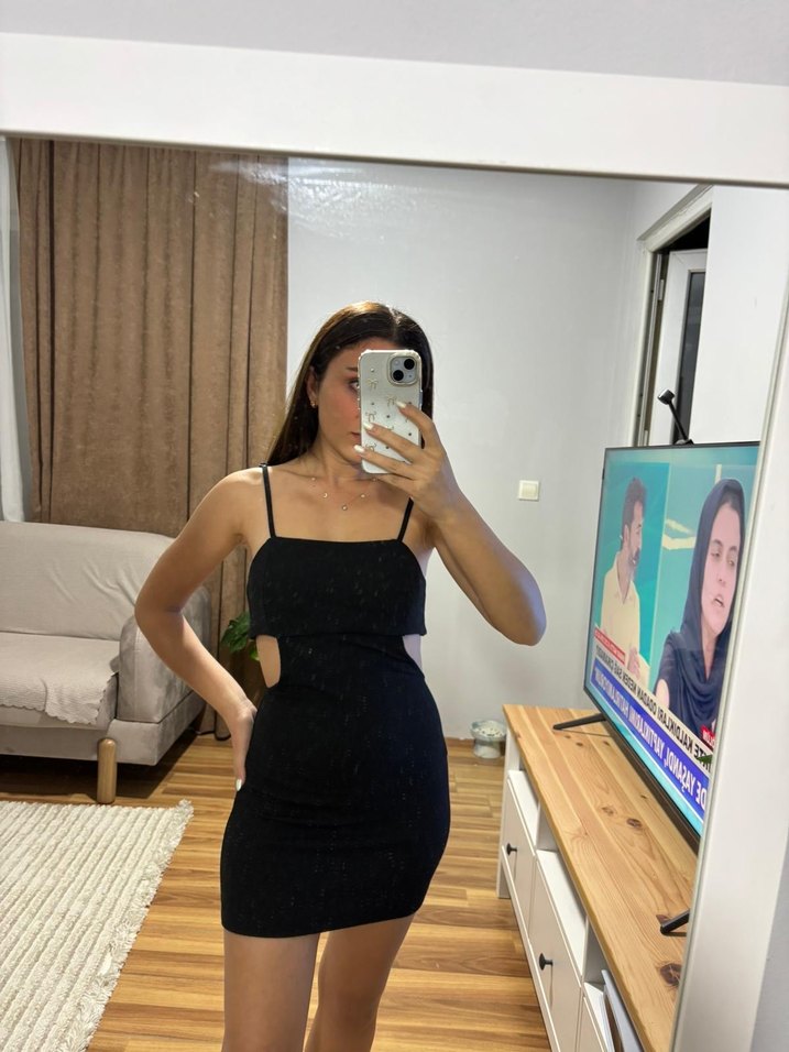 Düz siyah midi elbise, düz yaka ve ince askılı, sentetik kumaştan yapılmış, gotik tarzda şık ve rahat. Romantik akşamlar için ideal.