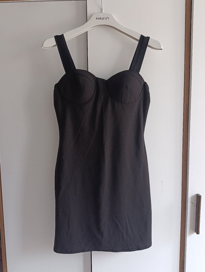 Siyah, straplez yakalı ve askılı kısa elbise. Minimalist gotik tarzda, günlük kullanıma uygun, zarif ve şık görünümlü.