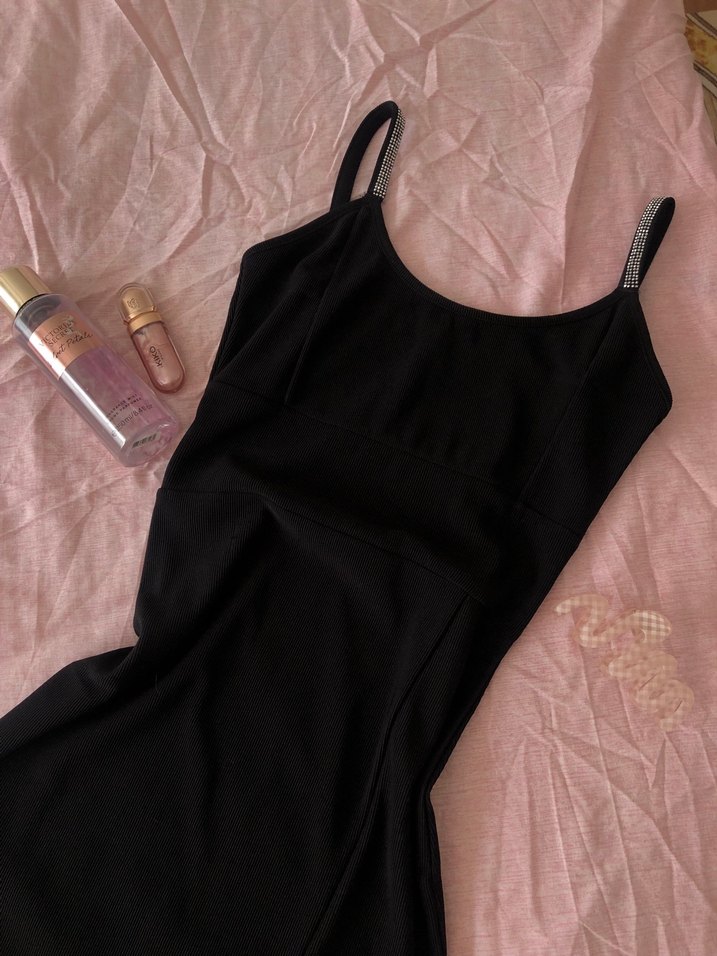 Siyah, strappy askılı ve askı kısmı taşlı, tek renk midi elbise. Tekne yakalı, vücuda oturan kesimiyle iddialı bir şıklık sunar. Günlük kullanıma uygundur.