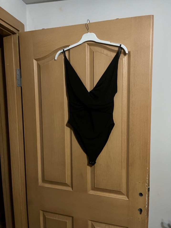 Bu siyah, strappy askılı mayo, derin V yakası ve vücuda oturan kesimiyle günlük kullanıma uygun cesur ve minimalist goth tarzı sunar.